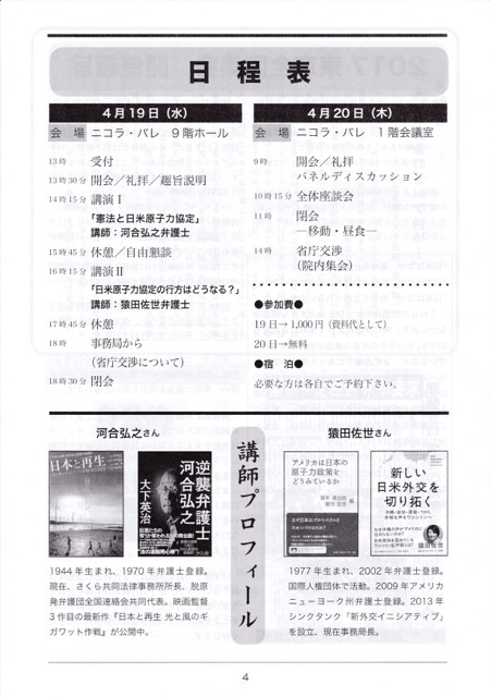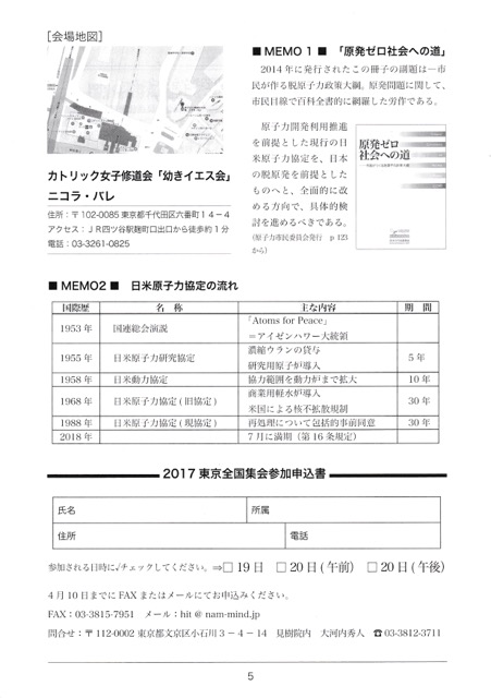 4月17日情報 お知らせいたします。 申込期日5日となっております。 ご確認の上、お申し込みください。 ---------- 転送メッセージ ---------- 原発学習会 『脱原発VS日米原子力協定』 主催:原子力行政を問い直す宗教者の会 4月19日(於:四谷ニコラ・バレ9階)13時半〜18時半 参加費:1000円(資料代として) 講演㈵「憲法と日米原子力協定」 講師:河合弘之弁護士 講演㈼「日米原子力協定の行方はどうなる?」 講師:猿田佐世弁護士 恐縮ですが、参加希望者は氏名・住所・電話番号を、添付ファイルの申込書に 記入して、4月5日までにFAXまたはメールにてお申込みください。 FAX:03-3815-7951 メール:hit@nam-mind.jp 問合せ:〒112-0002 東京都文京区小石川3−4−14 見樹院内 大河内秀人 電話03-3812-3711 *添付書類1 添付書類2 |