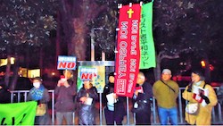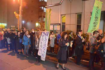 12月27日情報 賛同者の皆さん、キリスト者平和ネットです。 遅ればせながら・・・ 主のご降誕おめでとうございます! 24日のクリスマスイブには寒風吹きすさぶ中、官邸前にお集まりくださいました皆さま、本当にありがとうございました。 4,5人でとにかく歌い続けようと出かけたところ、いろいろな方の呼びかけで、25名くらいの方が駆け付け不十分な準備の中、一時間、沖縄を想い、歌い、祈ってくださいました。 つたない進行に猛反省!でしたが、皆さんの信仰に助けられ(キリスト者ではない方の熱い思いも含め)、今年最後の「首相官邸前でゴスペルを歌う会」を無事終えました。 渡部優子さんの写真をお送りします。