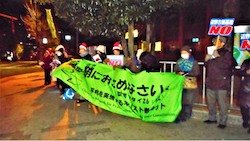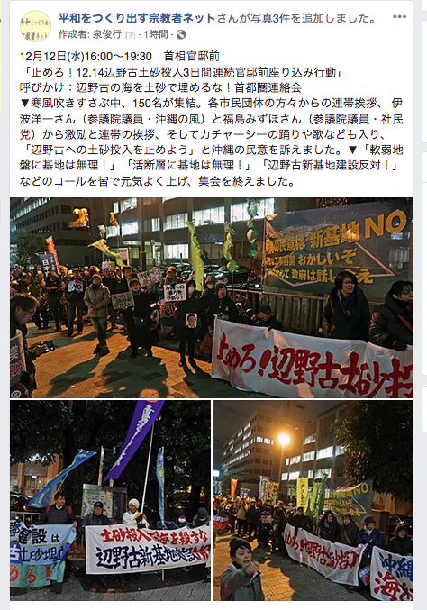 12月11日情報 お知らせいたします。 本土でできることをやり切りましょう。 明日からの3日連続行動です。 1時間の参加もありです。 ぜひお友だちを誘いましょう。 ~~~~~~~~~~~~~~~~~~~~ 止めろ!12.14辺野古土砂投入 3日間連続官邸前座り込み行動 辺野古の海への 「12月14日の土砂投入」をやめさせよう 政府は辺野古の海へ「12月14日から土砂投入を行う」と発表しました。 セレモニーであろうが「土砂投入」を強行することで、沖縄の人々を脅して「県民投票」に影響させようとしていると報道されています。 マスコミを利用してセンセーショナルに報道させることで全国や世界の人々にあきらめさせようとしていることを、見過ごしてはならないと思います。 そこで政府・防衛省への強い抗議を示すとともに、辺野古で起こっていることを知らない、関心のない多くの人に「土砂投入」は「おかしい」「許さない」という声を広めていくために次の行動を呼びかけます。 ①12月12日(水) 16:00~19:30 首相官邸前での座り込み(18:30~集会) *同時並行して17:30~18:30最寄り駅でパブリックビューイングとリーフレット配布 ②12月13日(木)12日と同様の行動 ③12月14日(金) 9:00~18:00首相官邸前座り込み 18:30~19:30議員会館前集会(官邸前から議員会館前に移動して行う) ★14日の「土砂投入」に対して全国で多くの人々が反対していることを示すために、各地で取り組んでいる仲間に全国一斉の共同行動を呼びかけます。 ★全国の「土砂投入」反対アクションの広がりを可視化するために、「#1212辺野古埋めるな全国アクション」のタグをつけてツイッター投稿することを呼びかけます(1212は当日の日付で) 呼びかけ◆辺野古の海を土砂で埋めるな!首都圏連絡会 https://henokoumeruna2018.exblog.jp 連絡先●辺野古への基地建設を許さない実行委員会 TEL:090-3910-4140(沖縄・一坪反戦地主会関東ブロック) ●平和を実現するキリスト者ネット TEL&FAX:03-3813-2885 ●辺野古・高江を守ろう!NGOネットワーク Emale:henokotakaengo@gmail.com |