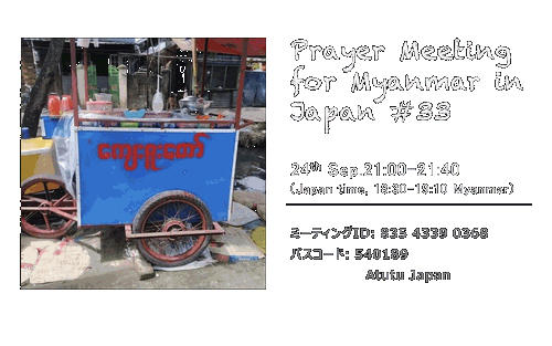 9月7日情報 賛同者の皆さま お知らせします。 ~~~~~~~~~~~~~~~~ 平和を実現するキリスト者ネット http://cpnet.bona.jp 〒112-0002 文京区小石川2-17-41 富坂キリスト教センター2号館 304号室 e:mail:cpnet@mica.dti.ne.jp ℡&Fax:03-3813-2885 ~~~~~~~~~~~~~~~ ---------- Forwarded message --------- From: S.Watanabe <s.watanabe@cmim.jp> アトゥトゥミャンマー支援 賛同者の皆さま ![]() 第31回 ミャンマーを覚える祈り会の情報共有です。 ミャンマー国内各都市で爆発が頻発しています。ミャンマー国軍はそれらをPDF(市民防衛隊)によるものだと発表していますが、PDF、また住民に多くの負傷者、死者が出ており、「国軍によるPDF支持者取り込みのアピール」と考えられています。国軍総司令官は自らの在任期間を延長し、軍事政権による市民支配の既成事実化を強めています。 国際社会は相変わらずの距離感の中、国内避難民の生活が相当に逼迫し、伝染病の蔓延、コロナ感染者への治療は民間で力を合わせて行われている状況が強まっています。そのような中で、世界的大きなネットワークではない小規模な団体が既に多くの支援を具体的に始めています。そのうちの一つがAtutu Japanです。私たちは、祈り会の中からこの団体を設立し、在日ミャンマー人の方々との関係を問いながら顔と顔とが見える支援を続けてきました。 先週から在日ミャンマー、ミャンマー本国の日本語学習支援がスタートしました。4つのコースにどんどん受講生が応募してこられました。日本に住んでいるミャンマー人のコロナ感染者への食糧支援、接種案内、カウンセリングも多くのボランティアの働きで進められています。 この運動の旋律となっている祈り会へ皆さんにぜひご参加いただきたく、今週もご案内いたします。(共同代表 渡邊さゆり) 2021年9月10日(金)午後9時〜9時40分 Zoomミーティングに参加する https://us02web.zoom.us/j/83543390368?pwd=MnNLMitPV2xLb25NbGNTc2FVejJoQT09 ミーティングID: 835 4339 0368 パスコード: 540189 アトゥトゥミャンマー支援の活動の様子は随時以下のグループサイトで共有中。 https://www.facebook.com/groups/2880956212156055 皆さんの活動団体、また知人などからのアトゥトゥへの賛同表明は s.watanabe@cmim.jp(渡邊さゆり) へメールでご連絡願います。 祈り会でお会いしましょう。 ************************************************************ Centre for Minority Issues and Mission Co-director Sayuri Watanabe マイノリティ宣教センター 共同主事 渡邊さゆり *********************************************************** s.watanabe@cmim.jp +81-36228-0509(Office) +90-9051-5966(Private) 〒169-0051東京都新宿区西早稲田2-3-18 日本キリスト教会館 52号室 2-3-18-52 Nishiwaseda Shinju Ku Tokyo 169-0051 Japan |