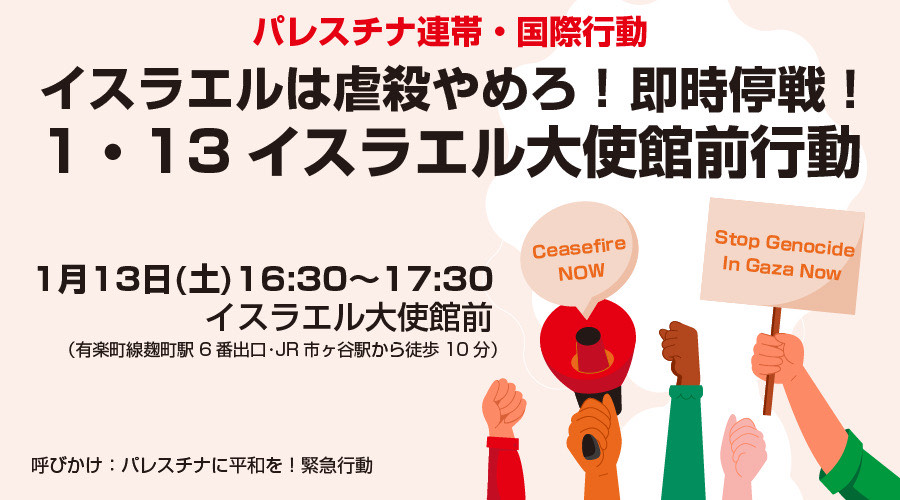 2月12日情報 ![]() 賛同者の皆さま ご協力お願いします。 ★①具志堅さんのハンスト署名依頼 その1 その2 ★②緊急FAX行動依頼 ★③1/18宗教者院内集会 ★④2/11,2/22行動 ★➄ICJ口頭弁論 ★⑥1/11新聞記事 ★⑦平和フォーラム・原水禁メールマガジン ★⑧正平協jp通信 24-001 ★⑨正平協jp通信 24-002 ~~~~~~~~~~~~~~~~ 平和を実現するキリスト者ネット http://cpnet.bona.jp 〒112-0002 文京区小石川2-17-41 富坂キリスト教センター2号館 304号室 e:mail:cpnet@mica.dti.ne.jp> ℡&Fax:03-3813-2885 ~~~~~~~~~~~~~~~~ ★①具志堅さんのハンスト署名依頼 皆様 1月10日から12日まで行われる沖縄戦遺骨収集ボランティア・ガマフヤー具志 堅隆松さんが沖縄県庁前でハンストを行う時に集める署名です。御協力をお願いいたし ます。合掌 武田隆雄 拝 「平和をつくり出す宗教者ネット」事務局 〒150-0045 渋谷区神泉町8-7 日本山妙法寺内 TEL 03-3461-9363 FAX 03-3461-9367 nqh10948@nifty.com https://twitter.com/syukyosyanet https://www.facebook.com/syukyosyanet/ 1月ハンスト時に署名を集めることになりました。 県外でも拡散お願いします。 谷 大二 →ワード添付 ★②緊急FAX行動依頼 みなさま 高田健です。 改憲原案作りの「作業部会設置に反対」する衆院・参院憲法審、立憲野党への緊急FAX行動のお願いです。 お願い文とFAX番号を添付します。 ご協力ください。 -- 高田健 <kenpo@galaxy.ocn.ne.jp> 東京都千代田区神田三崎町3-3-3 太陽ビル402市民ネット内 許すな!憲法改悪・市民連絡会 03-3221-4668 Fax03-3221-2558 http://web-saiyuki.net/kenpoh/ 戦争させない・9条壊すな!総がかり行動実行委員会 http://sogakari.com/ 憲法9条を壊すな!実行委員会 http://kyujokowasuna.com/ ★③1/18宗教者院内集会 皆様 今月の月例院内集会のご案内です。21年目に入っています。 ご参加をお願いいたします。合掌 武田隆雄 拝 「平和をつくり出す宗教者ネット」事務局 〒150-0045 渋谷区神泉町8-7 日本山妙法寺内 TEL 03-3461-9363 FAX 03-3461-9367 nqh10948@nifty.com https://twitter.com/syukyosyanet https://www.facebook.com/syukyosyanet/ ★④2/11,2/22行動 2 月11 日(日)2.11反「紀元節」デモ/2.22「天皇誕生日奉祝」反対集会* *2.11反「紀元節」デモ* *2 月11 日(日)* *14:00* *淡路公園*集合(JR 御茶ノ水駅聖橋口より徒歩3分) https://www.city.chiyoda.lg.jp/shisetsu/koen/awaji-ko.html *14:45 デモ出発* ************** *2.22「天皇誕生日奉祝」反対集会* 2 月*22* 日(木)*18:00* 開場/18:15 開始 *文京区民センター・2A 会議室*(地下鉄・春日駅・後楽園駅) *講演* *「徳仁天皇制の現在」* *斉藤小百合* さん(恵泉女学園大学教員・憲法学) *提戯 森 美音子* さん(テント芝居集団・野戦之月) 資料代500 円 ************* 主催 ●*「 紀元節」と「天皇誕生日奉祝」に反対する2.11&2.22連続行動* 【呼びかけ団体】 アジア連帯講座/研究所テオリア/市民の意見30 の会・東京/スペース21/戦時下の現在を考える講座/立川自衛隊 監視テント村/反安保実行委員会/天皇制問題情報交換会/ピープルズ・プラン研究所/「日の丸・君が代」強制反対の意思表示の会/靖国・天皇制問題情報センター/連帯社/労働運動活動者評議会 ■今年もまた「建国記念の日(2月11日)」(紀元節)、および即位後5回目となるナルヒトの「天皇誕生日(2月23日)」(天長節)が祝われようとしています。「日本国家」も「天皇」もなかった時代の神話上の初代天皇神武「即位」の日に国家の発祥を求めるものが「紀元節」であり、これは「天長節」とともに、天皇制明治国家の太政官布告として、もっとも初期から暦の上で「祝日」と扱われ機能してきたのです。私たちは、今年もまた、これらと対決する行動を行います。ぜひご参加下さい。 ★➄ICJ口頭弁論 ICJでの南アフリカの対イスラエル訴訟の口頭弁論が字幕付き中継されます https://kojiskojis.hatenablog.com/entry/2024/01/11/012710 東京の杉原浩司(武器取引反対ネットワーク:NAJAT/STOP大軍拡アクション)です。[転送・転載歓迎/重複失礼] 南アフリカがジェノサイドの罪でイスラエルを国際司法裁判所(ICJ)に提訴 しました。本日1月11日に行われるこの訴訟の南アフリカによる口頭弁論の模様が、zoom自動翻訳と通訳者要約の日本語字幕つきで中継されます。 今回の口頭弁論では、イスラエルにガザでの軍事作戦の停止を命じるなどの暫定措置を求める南アフリカの要請が扱われます。命令が出ても執行させる手段はありませんが、イスラエルへの明確な圧力として作用し、法的な先例となる可能性があります。なお、ICJの判事には日本人1名が含まれています。 1月2日、パレスチナ反アパルトヘイト調整委員会(PAACC)は、ジェノサイド条約加盟国に、イスラエルを訴えた南アフリカを支援するよう求めました。一方でイスラエルは、水面下で各国に南アフリカの訴訟に反対するよう圧力をかけています。日本は条約非加盟ですが、ジェノサイドを止める国際的義務を負っています。 一刻も早い停戦に向けて、世界が注視する訴訟です。日本政府に南アフリカへの「支持」を表明させることは市民の責務です。ぜひご視聴ください。 <参考> ロイターの動画ニュース 解説:南アフリカが国