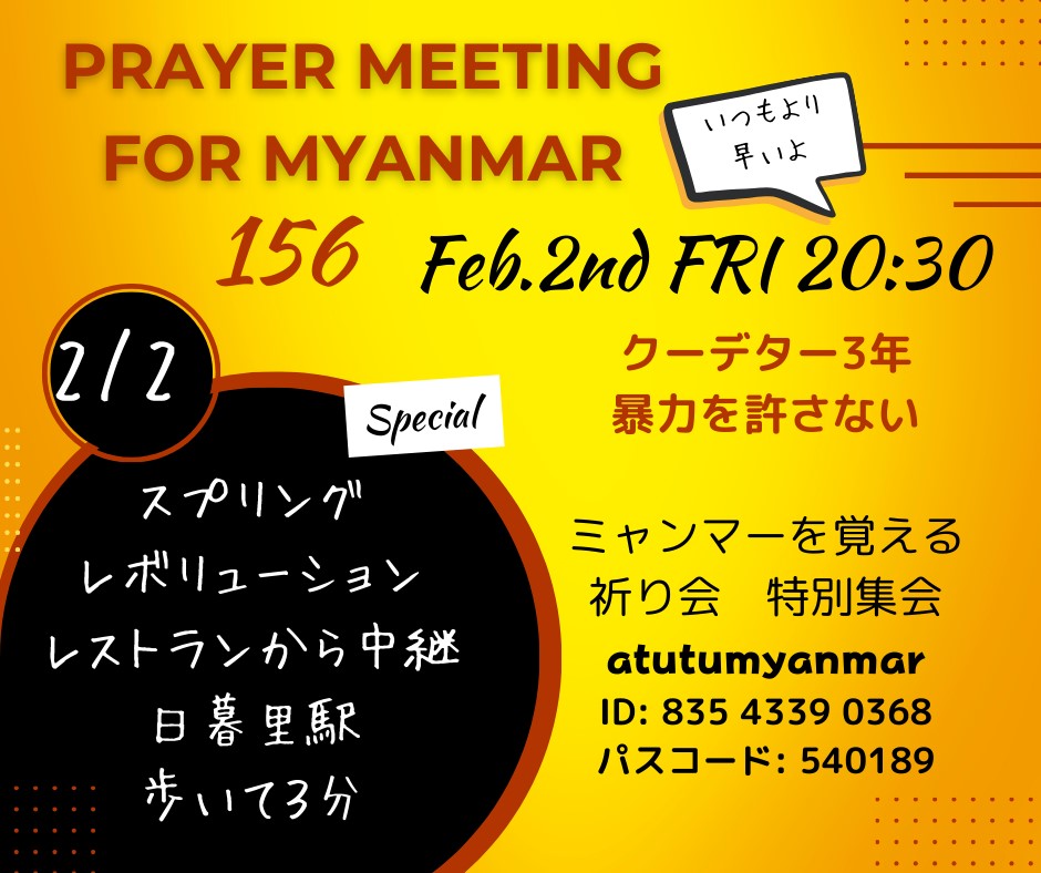 2月1日情報 賛同者の皆さま 5件お知らせします。 ★①<本日>【官邸前アクション】クーデターから3年 今こそミャンマー軍を利する日本からの資金の流れを止めるべき! ★②2/2(金)20:30~ アトゥトゥミャンマー祈り会 ★③2/6 秘密法廃止!共謀罪廃止!監視社会反対!「6日行動」へ! ★④2/14 宗教者院内集会と、声明文の賛同依頼 ★➄2/21 第2回新春セミナー ~~~~~~~~~~~~~~~~ 平和を実現するキリスト者ネット http://cpnet.bona.jp 〒112-0002 文京区小石川2-17-41 富坂キリスト教センター2号館 304号室 e:mail:cpnet@mica.dti.ne.jp> ℡&Fax:03-3813-2885 ~~~~~~~~~~~~~~~~ ★①<本日>【官邸前アクション】クーデターから3年 今こそミャンマー軍を利する日本からの資金の流れを止めるべき! 東京の杉原浩司(武器取引反対ネットワーク:NAJAT/STOP大軍拡アクション) です。[転送・転載歓迎/重複失礼] ミャンマーでの軍事クーデターから3年となる 本日2月1日、官邸前アクションが行われますのでぜひご参加ください。また、オンライン署名にも大至急ご賛同をお願いします。 【オンライン署名】 #ミャンマー軍の資金源を断て 日本政府にミャンマー軍を利するODAと公的資金供与事業の停止を求めます https://chng.it/hz42NdGZ ※クーデターから3年となる本日2月1日に第1回提出です。大至急ご署名ください! ------------------------------ 【官邸前アクション】 クーデターから3年 今こそミャンマー軍を利する日本からの資金の流れを止めるべき! https://foejapan.org/issue/20240123/15810/ 日時:2024年2月1日(木) 18時30分~19時30分 官邸前(最寄駅:国会議事堂前駅) ※新型コロナウイルス感染対策を各自にてお願いします(オンライン中継も予定) 2021年にミャンマーで軍がクーデターを起こしてから、この2月1日で3年となります。この間、ミャンマー軍によって殺害された人は4,399人に及び、今も2万人近い人たちが不当に拘束されたままです(1月19日時点 政治囚支援協会調べ)。 1月に国連人道問題調整事務所(OCHR)が発表した数字では、国内避難民は260万人に達したとされています。1027作戦と呼ばれる少数民族革命勢力の攻勢以降、軍がその支配地域を次々失っているという報道や分析が増えましたが、ミャンマー軍は勢力維持のため各地で空爆を続けており、村が焼かれ、子どもを含む多くの民間人が犠牲になる状況は変わりません。国際社会はそれに対し、有効な手を打てていません。 手をこまねいているのは、日本政府も同様です。クーデター以降、日本政府はミャンマー軍に対し、暴力の即時停止、拘束された関係者の解放、民主的な政治体制の早期回復を求めると繰り返し、アセアンの5つのコンセンサスを支持するとも表明しています。一方で、7,396億円にも上る政府開発援助(ODA)の円借款事業や、軍と繋がりのある民間投資への支援を継続しています。 実施中の円借款事業(ODA)には次のようなものがあります。 インフラ緊急復旧改善計画(フェーズ1) ティラワ地区インフラ開発計画(フェーズ1-3) 東西経済回廊幹線道路整備事業(バゴー・チャイトー間新道路) バゴー橋建設計画 バゴー地域西部灌漑開発計画 ヤンゴン・マンダレー鉄道整備計画(フェーズ1-2) ヤンゴン下水道整備計画 ヤンゴン環状鉄道改修計画 ヤンゴン都市開発計画 ヤンゴン都市圏上水整備計画(フェーズ1-2) ヤンゴン配電網改善計画(フェーズ1) 住宅金融拡充計画 水力発電所改修計画 全国基幹送変電設備整備計画(フェーズ1-2) 地方インフラ整備計画 地方主要都市配電網改善計画 中小企業金融強化計画(フェーズ1-3) 通信網改善計画 都市配電網整備計画 東西経済回廊整備計画 農業・農村開発ツーステップローン計画 農業所得向上計画 貧困削減地方開発計画(フェーズ1-2) また、これまでも指摘してきたとおり、ヤンゴン博物館跡地再開発事業(通称:Yコンプレックス事業)は、ミャンマー最大都市ヤンゴンで、陸軍が所有する軍事博物館跡地に大規模複合不動産を建設・運営する事業で、これに国土交通省所管の官民ファンドである海外交通・都市開発事業支援機構(JOIN)が出資している他、財務省所管の輸出信用機関である国際協力銀行(JBIC)が融資しています。事業の土地の賃貸借契約は、現地パートナー企業と兵站局幹部との間で結ばれており、賃料は兵站局が管理すると見られる口座に支払われ、軍が利用可能な資金となっています[1]。現在、賃料の支払いは止められているといいますが、再開すれば支払いは発生します。民間企業が工事を止めていても、日本政府が公的資金でこの事業を支援している状態は変わりません。 昨年12月には海外からの賛同も得て、要請書「ミャンマー軍を利するODAと公的資金供与事業の停止を日本政府に求めます」を外務省、財務省、国土交通省に提出し、同日夜に官邸前で日本政府に向けてのアピールを行いました。今回、この要請書に対する一般の賛同をオンライン署名で募り、再度日本政府に提出します。 日本政府にはまだ為すべきことが残っています。日本政府が実施中のODA事業については、一旦すべて停止すべきで