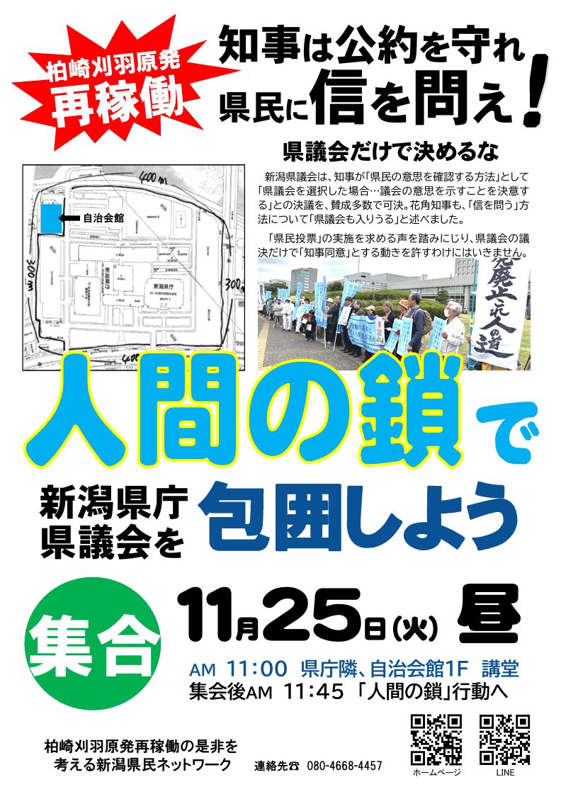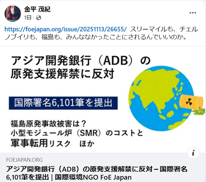 ![]() 11月21日情報 賛同者の皆様 3件お知らせします。 ★①昨日の宗教者院内集会記事 ★②2/11(印内)宗教者・信者の全国集会 ★③柏崎刈羽原発…! ~~~~~~~~~~~~~~~~ 平和を実現するキリスト者ネット http://cpnet.bona.jp 〒112-0002 文京区小石川2-17-41 富坂キリスト教センター2号館 304号室 e:mail:cpnet@mica.dti.ne.jp> ℡&Fax:03-3813-2885 ~~~~~~~~~~~~~~~~ ★①昨日の宗教者院内集会記事 皆様 昨日の院内集会の新聞記事をお送りいたします。 合掌 武田隆雄 拝 ★②2/11(印内)宗教者・信者の全国集会 ![]() 皆様 添付のように『「スパイ防止法」に反対する宗教者・信者全国集会』を開催いたします 。Zoomでの参加も可能です。ご参加並びに拡散をよろしくお願いいたします。 合掌 武田隆雄 拝 「平和をつくり出す宗教者ネット」事務局 〒150-0045 渋谷区神泉町8-7 日本山妙法寺内 TEL 03-3461-9363 FAX 03-3461-9367 nqh10948@nifty.com https://twitter.com/syukyosyanet https://www.facebook.com/syukyosyanet/ ★③柏崎刈羽原発…! 【速報】不祥事続きの東電の柏崎刈羽稼働を新潟県知事が認めるのか? 木村(雅)です。 花角知事が東電不祥事露見にもかかわらずいよいよ本日稼働容認しようとしています。 何としても東電の柏崎刈羽の再稼働を止めたいですね。 まだの方へぜひ次の署名をお願いします。また拡散もどうぞよろしく。 《オンライン署名にご協力ください》柏崎刈羽を動かさないで! 電力消費地域に住む私たちは東電柏崎刈羽原発の電力は要りません。 ![]() 東京電力による柏崎刈羽原発6号機の再稼働を止めてください。 【署名サイト】https://x.gd/Is1fi また、今夕の経産省前抗議、原発いらない金曜行動にもぜひご参加を。 【速報・柏崎刈羽原発再稼働】21日午後4時から、花角知事が臨時会見 2025/11/21 9:10 https://www.niigata-nippo.co.jp/articles/-/732526 県は21日午後4時から、東京電力柏崎刈羽原子力発電所の再稼働について、花角英世知事が臨時記者会見を県庁で開くと発表した。 【柏崎刈羽原発テロ対策不備】再稼働の“最終局面”で不祥事露見…東電の組織文化を疑問視「なぜそこでつまづくのか」 2025/11/20 22:15 https://www.niigata-nippo.co.jp/articles/-/732428 新たなテロ対策不備が20日に明らかになった東京電力柏崎刈羽原発では、これまでにもIDカードの不正利用など重大事案が相次ぎ、2021〜23年に原子力規制委員会が事実上の運転禁止命令を出す事態もあった。その後東電はテロ対策の改善を図ってきたはずだが、また新たな問題が露見した。6号機の再稼働に向けて最終局面を迎える中、改めて東電の組織文化を疑問視する声も上がった。 【追記】東電には原発を動かす資格はありません 東電は、事故直後から表明した「3つの誓い」(1.最後の一人まで賠償貫徹、2.迅速かつきめ細やかな賠償の徹底、3.和解仲介案の尊重)を破っている。 東電は、原子力規制委員会から求められた基本姿勢「七つの約束」を守っていない。例えば「福島第一原子力発電所の廃炉を主体的に取り組み、やり切る覚悟と実績を示すことができない事業者に、柏崎刈羽原子力発電所を運転する資格はない」を見れば明らか。 東電は、6号機プラントの原子炉で制御棒などトラブル続きで、原子力規制庁と面談中。 東電は、能登半島地震の国の地震本部の佐渡・新潟付近の新たな長期評価が出ていないのに稼働しようとしており、原子力規制庁と面談が12月までかかる。 東電は、84近くの訴訟を抱えている。 あれだけの事故を起こした事業者に原発を動かす資格はない。 … 木村雅英 KIMURA Masahide e-mail : kimura-m@ba2.so-net.ne.jp 携帯TEL : 080-5062-4196 Twitter |