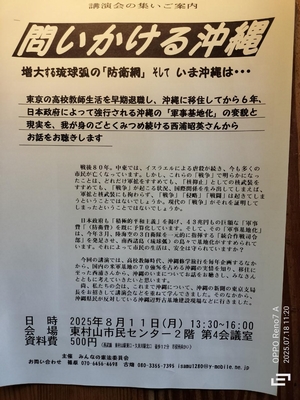 8月2日情 賛同者の皆様酷暑の8月ですが、がんばりましょう! ★①8/5 有楽町憲法街宣 ★②8/11、12 辺野古の今 ★③8/14、15 ガマフヤーの活動 ★④8/23 第196回市民憲法講座 ★⑤8/24 汚染水行動 ★⑥賛同御礼 参院選の排除主義✖ ★⑦外キ協メール便8月号 ★⑧日韓PFメールマガジンNo.8 ~~~~~~~~~~~~~~~ 平和を実現するキリスト者ネット http://cpnet.bona.jp 〒112-0002 文京区小石川2-17-41 富坂キリスト教センター2号館 304号室 e:mail:cpnet@mica.dti.ne.jp> ℡&Fax:03-3813-2885 ~~~~~~~~~~~~~~~~ 添付資料 水平へ漕ぎ出すー辺野古海上行動と裁判闘争(上映) 8・14具志堅さんにお話を聞く会ちらし 汚染水放出2周年スタンディングちらし 外キメール便 日韓和解と平和プラットフォームのメールマガジン第8号の案内 ★①8/5 有楽町憲法街宣 ■★二弁主催・日弁連・関弁連・東京三弁護士会共催の有楽町憲法街宣★のご案内 平和を願う鎮魂の8月。閣議決定直後の2014年7月3日から通算114回目となる有楽町弁護士会憲法街宣です。 安保法の廃止まで声を上げ続けたいと思います。応援よろしくお願いします。 ●ツイッター掲載★リツィートお願いいたします! https://x.com/niben_net/status/1950051167020450090 【日時】2025年8月5日(火)17:30~18:30 【場所】有楽町駅前交番裏・交通会館脇 【主催】第二東京弁護士会 【共催】日本弁護士連合会、関東弁護士会連合会、東京弁護士会、第一東京弁護士会 ●東京新聞に記事掲載! https://www.tokyo-np.co.jp/article/336996 ★日弁連初・憲法広報動画を2本公開中! 自衛隊明記 https://www.youtube.com/watch?v=u7r5_y39TPU <https://www.youtube.com/watch?v=u7r5_y39TPU&t=4s> &t=4s 緊急事態条項 https://www.youtube.com/watch?v=QwgkHa7E08Q ★新作・緊急事態条項「それ、いりません!」 https://www.nichibenren.or.jp/library/pdf/jfba_info/publication/pamphlet/kenpo_pmf_202311.pdf ★日弁連 敵基地攻撃能力反対リーフDLできます。 https://www.nichibenren.or.jp/library/pdf/jfba_info/publication/pamphlet/kenpo_pmf.pdf ★日弁連パンフレット「自衛隊……書き加えても何も変わらないの?」は、こちらでDLできます。 https://www.nichibenren.or.jp/library/ja/publication/booklet/data/kenpo_pmf.pdf ■動画公開!7.1集会「閣議決定10年 それでも安保法制は違憲だ」 https://www.youtube.com/watch?v=y0tYQA5ddA8 <https://www.youtube.com/watch?v=y0tYQA5ddA8&feature=youtu.be> &feature=youtu.be ■7月 113回目の様子 https://niben.jp/news/report/2025/202507174585.html ★②8/11、12 辺野古の今 各位 8月に東京に戻ります。 以下の集会で話をします。 よろしくお願いします。 西浦 8/12は、海上行動のDVDの鑑賞とカヌーの水沢さんと話もあります。 ■ 問いかける沖縄 8月11日(月・祝) 13時半~16時 東村山市民センター 2階 西武線東村山駅東口 久米川駅北口 徒歩12分 市役所向かい 主催 みんなの憲法委員会 (8/11 は西浦のみ) 連絡先 070-6456-4698(篠原) 080-3355-7395(古畑) ■ 辺野古海上行動と裁判闘争 辺野古の今を聞く会 8月12日(火) 19時~ 練馬区民・産業プラザ(ココネリ) 3階研修室2 西武池袋線・都営大江戸線・副都心線 練馬駅 北口1分 主催 語やびら沖縄 もあい練馬 連絡先 090-8311-6678(柏木) ★③8/14、15 ガマフヤーの活動 辺野古土砂全協・首都圏グループより 南部遺骨土砂自治体意見書に取り組まれてきた皆さまへ 政府が戦没者遺骨の混じる土砂による辺野古埋立てを撤回しないなかで、 8/14-15、今年も具志堅隆松さんが上京され下記の行動を行います。 皆さまの参加と激励、呼びかけを広げていただければと思います。 添付のチラシも参照ください。 *具志堅さんのお話-「新たな戦前」に抗するために ・日時 8月14日(木)18時30分~ ・会場 文京区民センター2A(春日・後楽園) ・お話 具志堅隆松さん ・資料代 500円 ・主催 具志堅隆松さんのお話を聴く会 *「カーチス・ルメイ氏への叙勲取り消しを求める」政府交渉 ・日時 8月14日(木)14時から(13時30分より通行証配布) ・会場 参議院議員会館101会議室 ・呼びかけ 遺骨収集ボランティア「ガマフヤー」 *靖国神社前で具志堅隆松さんがハンスト「戦没者の遺骨が混じる土砂を新基地建設の埋め立てに使うな」 ・8月15日(金)8時~16時頃 靖国神社前 ※ご都合のつく時間帯で激励をお願いします。通行人へのチラシ配付も行います。 ★④8/23 第196回市民憲法講座 > 第196回市民憲法講座:政治のデマにどう立ち向かうか~市民運動のこれからを考える~ > お話:菱山南帆子さん(許すな!憲法改悪・市民連絡会事務局長) > この度の参議院議員選挙ほど「政治のデマ」、フェイク・差別的な言辞が横行したことはまれなのではないか。 > このようなデマにどうしていままで政治に関心のなかった多くの人々が心を動かされてしまったのか。団塊世代から、Z世代などの社会背景を考えながら、世代間の分断を乗り越えて、これからの市民運動をどう進めていくか、運動の現場から考えます。 > 日時:8月23日(土)18:30~ > 会場:文京区民センター3C室(都営三田線春日駅すぐ) > 参加費:800円 > 主催:許すな!憲法改悪・市民連絡会 > 連絡先:03-3221-4668 > -- > 高田健 <kenpo@galaxy.ocn.ne.jp> > 東京都千代田区神田三崎町3-3-3 太陽ビル402市民ネット内 > 許すな!憲法改