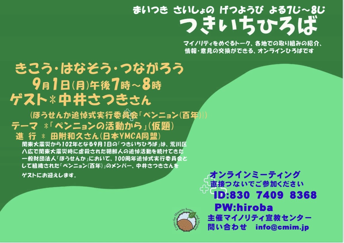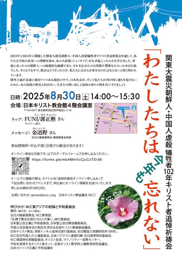 ![]() 8月25日情報 賛同者の皆様 4件おしらせします。 酷暑中ですが、16時からの官邸前ゴスペルに気を付けてお出かけください。 ★①宗教者ネットより新聞記事 8/23赤旗 ★②jpメールマガジン 025-053 案内8/26,8/30,8/31 ★③9/1 つきいちひろば、8/30キリスト者追悼祈祷会 ★④第197回市民憲法講座 9/27 添付資料 25.8.23赤旗記事 8.26連続祈念行動 関東大震災キリスト者祈祷会 関東大震災追悼大会 ![]() ~~~~~~~~~~~~~~~~ 平和を実現するキリスト者ネット http://cpnet.bona.jp 〒112-0002 文京区小石川2-17-41 富坂キリスト教センター2号館 304号室 e:mail:cpnet@mica.dti.ne.jp> ℡&Fax:03-3813-2885 ~~~~~~~~~~~~~~~~ ★①宗教者ネットより新聞記事 8/23赤旗 皆様 新聞記事を提供いたします。合掌 武田隆雄 拝 「平和をつくり出す宗教者ネット」事務局 〒150-0045 渋谷区神泉町8-7 日本山妙法寺内 TEL 03-3461-9363 FAX 03-3461-9367 nqh10948@nifty.com https://twitter.com/syukyosyanet https://www.facebook.com/syukyosyanet/ ★②jpメールマガジン 025-053 案内8/26,8/30,8/31 2025.8.25 p025-053 正義と平和協議会メール情報 ***jp***jp***jp***jp***jp***jp***jp*** 1. 渋谷ハチ公前第35回連続祈念行動 (2025.8.26 東京)添付1 2. 関東大震災朝鮮人・中国人虐殺犠牲者102年キリスト者追悼祈祷会(2025.8.30 東京 オンライン配信あり) 添付2 3. 関東大震災朝鮮人・中国人虐殺102年犠牲者追悼大会(2025.8.31 東京) 添付3 ***jp***jp***jp***jp***jp***jp***jp*** 1. 渋谷ハチ公前第35回連続祈念行動 (2025.8.26 東京) 添付1 憲法9条を守ろう! ―誰もがファースト、デマ・差別を許しませんー だれも殺すな!パレスチナ・ウクライナ・ミャンマーの市民のいのちを救おう! すべての宗教者・市民は、大同団結し、戦争の原因をつくり出すデマ・差別に反対し、パレスチナ・ウクライナ・ミャンマーの市民の命を救うため、祈り行動してまいりましょう。 憲法9条を持つ日本政府は、すべての戦争に反対し、対話による平和外交を展開するよう求めてまいりましょう。 ご参加をお願いいたします。(熱中症対策をお願いいたします。) ◎8月26日(火)16時〜17時 渋谷ハチ公前広場(交番前付近) ※都合により場所を近くに移動する場合があります。 ※プラカード・のぼり・横断幕をご持参ください。目に見えるかたちで祈り訴えてまいります。 呼びかけ 平和をつくり出す宗教者ネット 日本カトリック正義と平和協議会 平和を実現するキリスト者ネット 基地のない沖縄をめざす宗教者の集い (連絡先:090−6711−5573(江上)) 2. 関東大震災朝鮮人・中国人虐殺犠牲者102年キリスト者追悼祈祷会(2025.8.30 東京 オンライン配信あり) 添付2 「わたしたちは 今年も わすれない」 2023年と2024年に開催した関東大震災朝鮮人・中国人虐殺犠牲者キリスト者追悼集会を通して、私たちは当時の状況への理解を深め、あの大虐殺(ジェノサイド)がなぜ起こったのかを学びました。背後にあったのは朝鮮人への侮蔑的な風潮であり、それを広めたのは軍隊や警察などのいわゆる行政でした。そのような中で、教会はどうだったのか。私たちには自らを省みなければならないと深く問われています。 排外主義が急速に強まりつつある現状の中で、日本社会が、そして私たちが再び同じ過ちを犯さないために、あの虐殺の歴史と向き合い、生き方の問い直しと追悼の祈りの時を共に守りましょう。 日時:2025年8月30日 (土) 14:00~15:30 会場:日本キリスト教会館4階会議室 (最寄駅 東京メトロ東西線 早稲田駅 https://ncc-j.org/access/) メッセージ: 金迅野(キムシンヤ) さん(在日大韓基督教会 横須賀教会牧師) ラップ: FUNIフニ/郭正勲(カク・チョンフン)さん(ラッパー、詩人) 参加費無料 会場献金があります オンライン参加も可能です。以下のグーグルフォームでお申し込みください。 https://forms.gle/mb4MmVcCjcCzTEr36 メールでご連絡の際は、タイトル名「追悼祈祷会オンライン申し込み」で下記お問い合わせアドレスまで。申込者にオンライン情報をお送りいたします。 申し込み締め切り8月29日。 呼びかけ:NCC東アジアの和解と平和委員会 お問い合わせ:general@ncc-j.org 日本キリスト教協議会(NCC) 3. 関東大震災朝鮮人・中国人虐殺102年犠牲者追悼大会(2025.8.31 東京) 添付3 歴史に向き合い、国家の責任を問い、再発を許さない共生社会への歩みをともに! 日時 8月31日(日)13時半開会(13時開場) 資料代1,000円 場所 明治大学リバティタワー1階リバティホール(1013教室) ※先着順 資料代1,000円 Ⅰ部【追悼式】 黙 祷 会式挨拶 遺族挨拶 朝鮮半島から 中国から 国会議員挨拶 追悼パフォーマンス Ⅱ部【関東大虐殺の責任をただす集い】 連帯挨拶 韓国から 講演「震災ジェノサイドから102年-いま問われること」 安田浩一さん(ジャーナリスト) 報告 各地の取組み 北米市民グループのメッセージほか 主催 関東大震災朝鮮人・中国人虐殺100年犠牲者追悼大会実行委員会 連絡先 関東大震災中国人受難者を追悼する会(080-1142-2515) 村山首相談話の会(090-8808-5000) 日韓民衆連帯全国ネットワーク(070-6997-2546) 日朝協会(03-3237-1991) 関東大震災時朝鮮人虐殺の史実を知り追悼する神奈川実行委