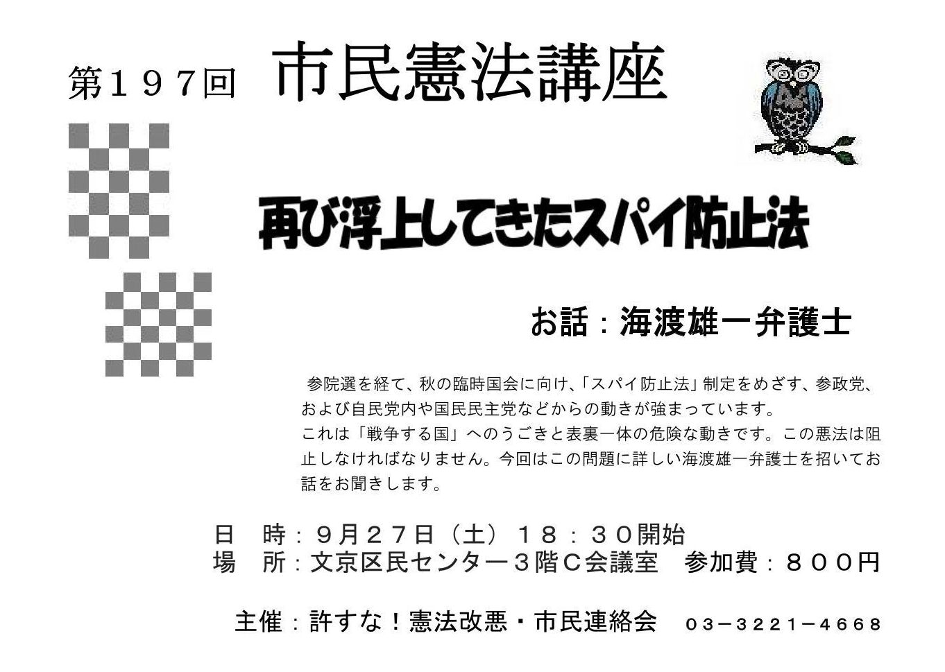 8月18日情報 賛同者の皆様 2件お知らせします。 ★①9/15 上映会「島から島へ」 ★②9/27 第197回市民憲法講座講演会 ~~~~~~~~~~~~~~~~ 平和を実現するキリスト者ネット http://cpnet.bona.jp 〒112-0002 文京区小石川2-17-41 富坂キリスト教センター2号館 304号室 e:mail:cpnet@mica.dti.ne.jp> ℡&Fax:03-3813-2885 ~~~~~~~~~~~~~~~~ ---------- Forwarded message --------- From: <to.saiki@gaea.ocn.ne.jp> Date: 2025年8月17日(日) 9:18 Subject: 拡散のお願い To: 昼間 範子 <hiruma@cbcj.catholic.jp> ★①9/15 上映会「島から島へ」 皆さま 見逃してしまった台湾の映画ですが、上智大学が企画してくださいました。 是非、拡散をお願い致します。 https://dept.sophia.ac.jp/is/igc/detail.php?n=2025016 お力をお貸し下さいませ。 齊木登茂子 ★②9/27 第197回市民憲法講座講演会 9月27日(土)の第197回市民憲法講座です。 「再び浮上してきたスパイ防止法」のテーマで、海渡雄一弁護士が講演します。 開会は18:30~、お話の時間は90分、その後30分の質疑応答です。 会場は文京区民センター3C室です。 -- 高田健 <kenpo@galaxy.ocn.ne.jp> 東京都千代田区神田三崎町3-3-3 太陽ビル402市民ネット内 許すな!憲法改悪・市民連絡会 03-3221-4668 Fax03-3221-2558 http://web-saiyuki.net/kenpoh/ 戦争させない・9条壊すな!総がかり行動実行委員会 http://sogakari.com/ 憲法9条を壊すな!実行委員会 http://kyujokowasuna.com/ 九条の会事務局 mag@9jounokai.jp |