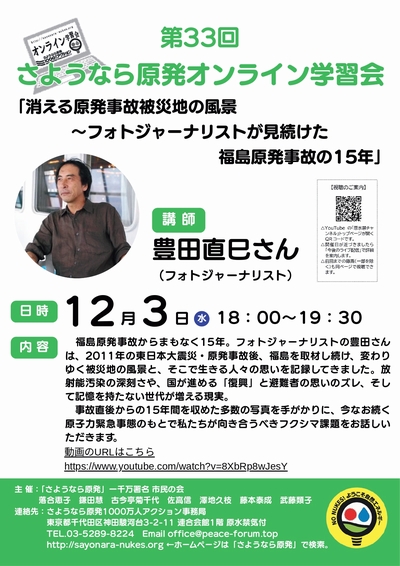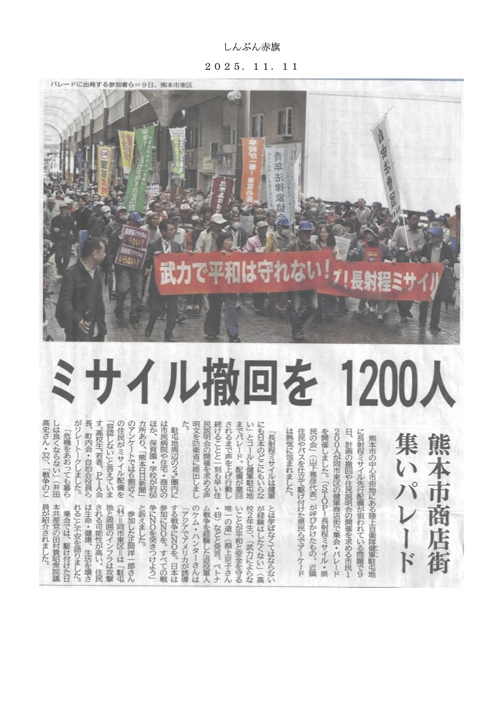 ![]() 11月27日情報 賛同者の皆様 5件お知らせします ★①11/29 再処理定例デモ ★②12/3 さようなら原発オンライン学習会 ★③12/4 高市発言撤回!官邸前 ★④12/11 南京大虐殺証言集会 ★⑤12/12 キャロリング・フォー・ピース2025 ~~~~~~~~~~~~~~~~ 平和を実現するキリスト者ネット http://cpnet.bona.jp 〒112-0002 文京区小石川2-17-41 富坂キリスト教センター2号館 304号室 e:mail:cpnet@mica.dti.ne.jp> ℡&Fax:03-3813-2885 ~~~~~~~~~~~~~~~~ 添付資料 再処理止めたい定例デモin銀座ちらし 南京大虐殺から88年証言集会 キャロリングちらし ★①11/29 再処理定例デモ 再処理止めたい!首都圏市民のつどい主催の定例デモです。 お時間がありましたら、ぜひご参加ください。 井上 拝 ★②12/3 さようなら原発オンライン学習会 第33回オンライン学習会「消える原発事故被災地の風景〜フォトジャーナリストが見続けた福島原発事故の15年」 お 話:豊田直巳さん(フォトジャーナリスト) 日 時:12月3日(水)18:00~ 内 容:福島原発事故からまもなく15年。フォトジャーナリストの豊田さんは、2011年の東日本大震災・原発事故後、福島を取材し続け、変わりゆく被災地の風景と、そこで生きる人々の思いを記録してきました。放射能汚染の深刻さや、国が進める「復興」と避難者の思いのズレ、そして記憶を持たない世代が増える現実。 事故直後からの15年間を収めた多数の写真を手がかりに、今なお続く原子力緊急事態のもとで私たちが向き合うべきフクシマ課題をお話しいただきます。 主 催 「さようなら原発」一千万署名 市民の会 落合恵子 鎌田慧 古今亭菊千代 佐高信 澤地久枝 藤本泰成 武藤類子 連絡先 さようなら原発1000万人アクション実行委員会 東京都千代田区神田駿河台3-2-11 連合会館1階 原水禁気付 TEL.03-5289-8224 Email office@peace-forum.top http://sayonara-nukes.org ←ホームページは「さようなら原発」で検索 第33回さようなら原発オンライン学習会_チラシ_page-0001.jpg ★③12/4 高市発言撤回!官邸前 『高市発言撤回!日中戦争を煽るな!12・4官邸前緊急行動』( #1204官邸前緊急行動 ) 12/4(木)19:00~ 首相官邸前 各種共有ボタンで拡散を!詳細は→https://kyujokowasuna.com/?p=4498 11月7日の衆院予算委員会での高市首相の「台湾有事・存立危機事態」発言は、日本と中国の関係を極度に緊張させつつあります。高市首相は、いたずらに両国の対立と緊張、戦争をあおるのではなく、この発言を直ちに撤回し、平和的な共存の道を探るべきです。 日時:12月4日(木曜日)19:00? 場所:首相官邸前 呼びかけ:憲法9条を壊すな!実行委員会 第1回の11・25緊急行動呼びかけ団体は以下です。ひきつづき呼びかけ団体を募集します。kenpo@galaxy.ocn.ne.jp または03-3221-4668へご連絡を。 憲法9条を壊すな!実行委員会 許すな!憲法改悪・市民連絡会 憲法を生かす会 安保法制の廃止をめざす中野アピール実行委員会 平和をつくり出す宗教者ネット 日本山妙法寺 基地のない沖縄をめざす宗教者の集い 日韓民衆連帯全国ネットワーク 村山首相談話の会 STOP改憲・北区の会 田端・中里九条の会 日本戦没学生記念会(わだつみ会) 共謀罪No!実行委員会 「秘密保護法」廃止へ!実行委員会 研究所テオリア 平和をつくる大和市民の会 「憲法」を愛する女性ネット 日韓和解と平和プラットフォーム 戦争させない千代田の会 ふぇみん婦人民主クラブ 全労協石油退職者ユニオン 憲法九条やまとの会 平和を実現するキリスト者ネット 平和といのち・イグナチオ9条の会 戦争準備に反対する首都圏反基地交流会 医療と福祉の戦争協力に反対する連絡会議 千住九条の会 戦争させない9条壊すな品川総がかり行動実行委員会 なの花会 ふじさわ・九条の会 「止めよう!辺野古埋め立て」国会包囲実行委員会 フェミブリッジ・東京 メディアネットちきゅう座 東京・地域ネットワーク 憲法骨抜きNO!ねりま 仝譴笋咾蕾㌃ もあい練馬 (首都圏以外のみなさん) とめよう改憲!おおさかネットワーク 赤とんぼの会(大分県)有志 ゆいま~る?とやま沖縄つなぐ会 PeaceActionうえだ(長野県) 戦争させない、9条壊すな!釧路行動実行委員会 不戦へのネットワーク(愛知県)私たちでつくる東アジアの平和(大分県) 戦争止めよう!沖縄・西日本ネットワーク 共同代表 具志堅隆松、呉羽真弓、高井弘之、海北由希子 許すな!「日の丸・君が代」強制、止めよう!改憲と教育破壊 全国ネットワーク(ひのきみ全国ネットワーク) ピースリンク広島・呉・岩国 平和を求め軍拡を許さないおんなたちの会・熊本 平和を求め軍拡を許さないおんなたちの会・大分 広島瀬戸内新聞 市民自治を創る会(北海道)呉YWCA憲法カフェ(広島) 憲法・教育基本法改悪に反対する市民連絡会おおいた 『週刊金曜日』大分読者会 -- 高田健 <kenpo@galaxy.ocn.ne.jp> 東京都千代田区神田三崎町3-3-3 太陽ビル402市民ネット内 許すな!憲法改悪・市民連絡会 03-3221-4668 Fax03-3221-2558 http://web-saiyuki.net/kenpoh/ 戦争させない・9条壊すな!総がかり行動実行委員会 http://sogakari.com/ 憲法9条を壊すな!実行委員会 http://kyujokowasuna.com/ 九条の会事務局 mag@9jounokai.jp ★