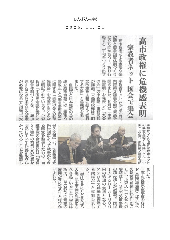 11月4日情報 賛同者の皆様 7件お知らせします。 ★①11・3憲法集会の新聞記事 ★②jpメールマガジン ★③11/13 ハチ公前行動 ★④矯風会より2件 ★⑤市民連合声明:高市政権誕生によせて ★⑥外キ協メール便 11月号 ★⑦JR顔認証カメラシステム停止について ★⑧『スパイ防止法反対!日米同盟強化による軍拡を許すな!11・19国会議員会館前行動』 ~~~~~~~~~~~~~~~~ 平和を実現するキリスト者ネット http://cpnet.bona.jp 〒112-0002 文京区小石川2-17-41 富坂キリスト教センター2号館 304号室 e-mail:cpnet@mica.dti.ne.jp> ℡&Fax:03-3813-2885 ~~~~~~~~~~~~~~~~ 添付資料 11.04赤旗 1106死刑廃止セミナー ハチ公前連続祈念行動ちらし 11.13連続祈念行動ちらし 1115林陽子さん講演会 原子力基本法改悪について 外キ協メール便 JR東日本顔認証停止 ★①11・3憲法集会の新聞記事 宗教者ネットより新聞記事 皆様 昨日の憲法集会の記事をお送りいたします。 合掌 武田隆雄 拝 「平和をつくり出す宗教者ネット」事務局 〒150-0045 渋谷区神泉町8-7 日本山妙法寺内 TEL 03-3461-9363 FAX 03-3461-9367 nqh10948@nifty.com https://twitter.com/syukyosyanet https://www.facebook.com/syukyosyanet/ ★②jpメールマガジン 2025.11.04 p025-057 正義と平和協議会メール情報 ***jp***jp***jp***jp***jp***jp***jp*** 1.第37回死刑廃止セミナー「死刑という制度と奪われた日常―家族に刻まれる見えない刑」(2025.11.6 滋賀、オンライン配信)添付1 2.渋谷ハチ公前第38回連続祈念行動 (2025.11.13 東京) 添付2 ***jp***jp***jp***jp***jp***jp***jp*** 1.第37回死刑廃止セミナー「死刑という制度と奪われた日常―家族に刻まれる見えない刑」(2025.11.6 滋賀、オンライン配信)添付1 「死刑を止めよう」宗教者ネットワーク 第37回死刑廃止セミナー「死刑という制度と奪われた日常 ――家族に刻まれる見えない刑」 日 時:2025年11月6日(木)18:00~20:0 会 場:日本キリスト教団 大津教会(滋賀県大津市末広町6−6) アクセス⇒アクセス/コンタクト – 日本キリスト教団大津教会 ※会場に駐車場はございません。 講 師:松本麗華 (Matsumoto Rika)さん 1983年、松本智津夫の三女として誕生。父は後に、麻原彰晃を名乗り、オウム真理教の教祖になる。 大学で心理学を学び、2015年に手記『止まった時計』(講談社)を出版し、自らの体験を社会に公表した。 以降、実名で活動を続け、メディア出演や講演、執筆を通じて社会との対話を重ねている。 著書に『被害者家族と加害者家族 死刑をめぐる対話』(2023年 共著 岩波ブックレット)、 『加害者家族として生きて』(2025年 創出版)があり、個人としての歩みを発信し続けている。 ※3冊の著書は、当日会場でも販売します。 資料代:500円(会場参加の方のみ。申し込みは不要です) 配 信:オンライン配信もございます。申し込み不要、参加無料です。 下記のURL からYouTubeのライブ配信をご視聴ください。 https://tinyurl.com/m9yzn885 主 催:「死刑を止めよう」宗教者ネットワーク https://www.facebook.com/shikei.tomeyou/ 問合せ:shikei.tomeyou@gmail.com 2.渋谷ハチ公前第38回連続祈念行動 (2025.11.13 東京)添付2 憲法9条を守ろう!スパイ防止法反対!―誰もがファースト、デマ・差別を許しませんー だれも殺すな!パレスチナ・ウクライナ・ミャンマーの市民のいのちを救おう! すべての宗教者・市民は、大同団結し、戦争の原因をつくり出すデマ・差別に反対し、パレスチナ・ウクライナ・ミャンマーの市民の命を救うため、祈り 行動してまいりましょう。また、現代の治安維持法である「スパイ防止法」に反対しましょう。 憲法9条を持つ日本政府は、すべての戦争に反対し、対話による平和外交を展開するよう求めてまいりましょう。 日時 11月13日(木)16時〜17時 場所 渋谷ハチ公前広場(交番前付近) ※都合により場所を近くに移動する場合があります。 ※プラカード・のぼり・横断幕をご持参ください。 目に見えるかたちで祈り訴えてまいります。 呼びかけ 平和をつくり出す宗教者ネット/日本カトリック正義と平和協議会/平和を実現するキリスト者ネット/基地のない沖縄をめざす宗教者の集い (連絡先:090−6711−5573(江上)) -- ***jp***jp***jp***jp***jp***jp***jp***jp***jp** *平和をつくりだす宗教者ネット 「戦争する国」に反対し、脱原発・共謀罪廃止を求める 要請書 (毎月署名できます) http://www.shukyosha9jonowa.org/news/youbou201706_n1.pdf *『憲法改悪を許さない全国署名』 (正義と平和協議会とりまとめの署名用紙はこちらからダウンロードできます) https://www.jccjp.org/wordpress/wp-content/uploads/2022/01/No-kaiken-syomei.pdf *平和、いのち、くらしを壊す 大軍拡、大増税に反対する請願署名 (正義と平和協議会とりまとめの署名用紙はこちらからダウンロードできます) https://www.jccjp.org/wordpress/wp-content/uploads/2023/03/daigunkakuhantai.pdf ***jp***jp***jp***jp***jp***jp***jp***jp***jp** 本メールは配信専用です。お問い合わせは下記までお願いいたします。 日本カトリック正義と平和協議会 Japan Catholic Council for Justice and Peace TEL 03-5632-4444 FAX 03-5632-7920 〒135-8585 東京都江東区潮見2-10-10 カトリック中央協議会 jccjp@cbcj.catholic.jp ★③11/13 ハチ公前行動 皆