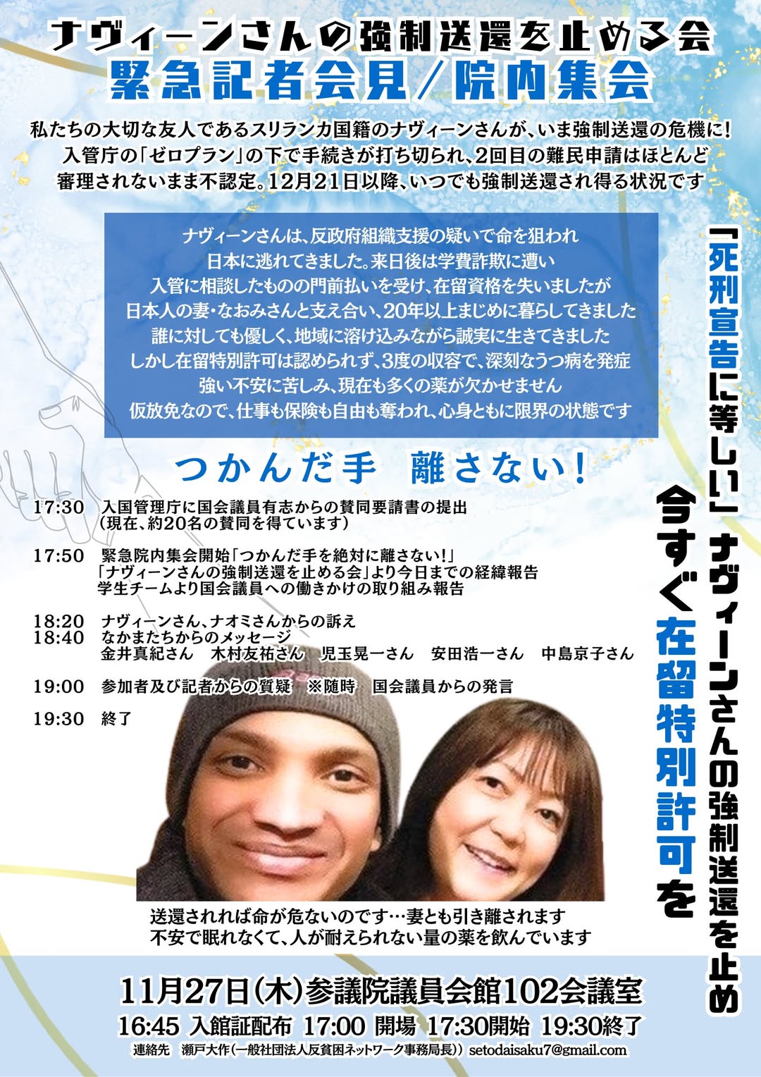11月25日情報 賛同者の皆様 4件おしらせします。 ★①11/25●高市発言撤回!日中戦争を煽るな!官邸前緊急行動 ★②11/27ナヴィーンさんの強制送還を止める会緊急院内集会 ★③11/29【Zoom29】差別排外主義に抗す ★④12/1ミャンマー民主化官邸前スタンディング ~~~~~~~~~~~~~~~~ 平和を実現するキリスト者ネット http://cpnet.bona.jp 〒112-0002 文京区小石川2-17-41 富坂キリスト教センター2号館 304号室 e:mail:cpnet@mica.dti.ne.jp> ℡&Fax:03-3813-2885 ~~~~~~~~~~~~~~~~ ★①11/25●高市発言撤回!日中戦争を煽るな!官邸前緊急行動 ●高市発言撤回! 日中戦争を煽るな! 11・25官邸前緊急行動 日時:11月25日(火)18:30~ 場所:首相官邸前 いま、声をあげましょう。鳴り物、光るもの、自作のプラカード、意思表示できるもの工夫して持ってきてください。 ●呼びかけ団体になってくださるグループを募集中です。 (呼びかけ団体・順不同・到着順) 憲法9条を壊すな!実行委員会 許すな!憲法改悪・市民連絡会 憲法を生かす会 安保法制の廃止をめざす中野アピール実行委員会 平和をつくり出す宗教者ネット 日本山妙法寺 基地のない沖縄をめざす宗教者の集い 日韓民衆連帯全国ネットワーク 村山首相談話の会 STOP改憲・北区の会 田端・中里九条の会 日本戦没学生記念会(わだつみ会) 共謀罪No!実行委員会 「秘密保護法」廃止へ!実行委員会 研究所テオリア 平和をつくる大和市民の会 「憲法」を愛する女性ネット 日韓和解と平和プラットフォーム 戦争させない千代田の会 ふぇみん婦人民主クラブ 全労協石油退職者ユニオン 憲法九条やまとの会 平和を実現するキリスト者ネット 平和といのち・イグナチオ9条の会 戦争準備に反対する首都圏反基地交流会 ●(首都圏以外のみなさん) とめよう改憲!おおさかネットワーク 赤とんぼの会(大分県)有志 ゆいま~る?とやま沖縄つなぐ会 PeaceActionうえだ(長野県) 戦争させない、9条壊すな!釧路行動実行委員会 不戦へのネットワーク(愛知県)私たちでつくる東アジアの平和(大分県) 戦争止めよう!沖縄・西日本ネットワーク 共同代表 具志堅隆松、呉羽真弓、高井弘之、海北由希子 許すな!「日の丸・君が代」強制、止めよう!改憲と教育破壊 全国ネットワーク(ひのきみ全国ネットワーク) ピースリンク広島・呉・岩国 平和を求め軍拡を許さないおんなたちの会・熊本 (以上、11月21日現在) 表示を縮小 -- 高田健 <kenpo@galaxy.ocn.ne.jp> 東京都千代田区神田三崎町3-3-3 太陽ビル402市民ネット内 許すな!憲法改悪・市民連絡会 03-3221-4668 Fax03-3221-2558 http://web-saiyuki.net/kenpoh/ 戦争させない・9条壊すな!総がかり行動実行委員会 http://sogakari.com/ 憲法9条を壊すな!実行委員会 http://kyujokowasuna.com/ 九条の会事務局 mag@9jounokai.jp ★②11/27ナヴィーンさんの強制送還を止める会 緊急院内集会 私たちの大切な友人であるスリランカ国籍のナヴィーンさんが、強制送還の危機にあります。入管庁が進める「ゼロプラン」の下で送還が強化される中、ナビーンさんのもとに「口頭意見陳述不実施通知書」と「手続終結通知書」が届きました。 11月21日、入管庁に出頭したところ、2回目の難民申請が実質的に審理されないまま終結し審査結果が不認定とされました。12月21日以降に、いつでも強制送還する事を入管庁から口頭通知されています。。 【緊急院内集会と法務省・入管庁への要請行動に参加ください】 11月27日(木) 16時45分 入館証配布 17時 開場 17時30分開始 場所 参議院議員会館102会議室 -内容- 入国管理庁に国会議員有志からの賛同要請書の提出 (現在 約20名の賛同を得ています) 緊急院内集会開始 つかんだ手を絶対に離さない! ●「ナヴィーンさんの強制送還を止める会」より今日までの経緯についての報告 学生チームより国会議員への働きかけの取り組み報告 ●ナヴィーンさん、ナオミさんからの訴え ●なかまたちからのメッセージ 金井真紀さん 木村友祐さん 児玉晃一さん 安田浩一さん 中島京子さん ●参加者及び記者からの質疑 ●随時 国会議員からの発言を頂きます。 19時30分 終了 【参考資料】 ![]() ■ ナヴィーンさんの歩みと現在の苦しみ ナヴィーンさんは20年前、スリランカで反政府組織の支援に関わったことから命を狙われ、日本に逃れてきました。、留学生として来日しましたが、入学後間もなくして学費を仲介業者に着服されたことがわかり入管に相談したものの門前払いを受け、不信と孤立の中で在留資格を失いました。その後、日本で出会った妻のなおみさん(日本人)と支え合いながら、21年間この国で暮らしてきました。誰に対しても優しく、地域に溶け込みながら誠実に生きてきました。しかし、在留特別許可は認められず、3度の収容を経験。過酷な環境の中で深刻なうつ病を発症し、現在も多くの薬に頼って生活しています。 「死刑宣告に等しい。送還されるかもしれないと思うと、ずっと不安で眠れなくて、普通の人が耐えられないくらいの量の薬を飲んでいる。なおみさんも辛い。家族もバラバラになる」と語ります。このように強制送還されれば命の