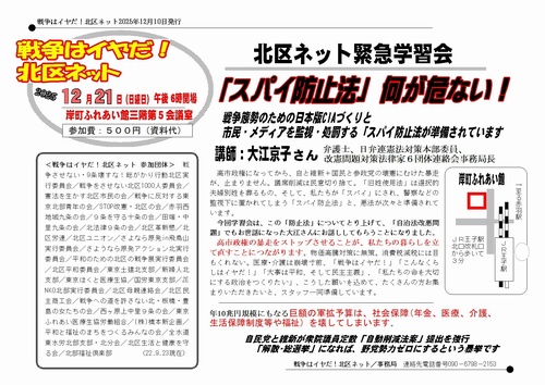 ![]() 12月16日情報 賛同者の皆様 9件お知らせします ★①高市は確信犯 ★②今週の行動予定12/15,17,19 ★③12/16 スパイ防止法院内集会 ★④12/17 子ども甲状腺裁判第16回口頭弁論 ★⑤12/26 女性党首・幹事長の共同街宣 ★⑥来年2/7-8 市民運動全国交流集会@呉 ★⑦スパイ防止法宗教者全国集会 報道とアピール文 ★⑧神戸学生センターニュース ★⑨月桃通信No48 ~~~~~~~~~~~~~~~~ 平和を実現するキリスト者ネット http://cpnet.bona.jp 〒112-0002 文京区小石川2-17-41 富坂キリスト教センター2号館 304号室 e:mail:cpnet@mica.dti.ne.jp> ℡&Fax:03-3813-2885 ~~~~~~~~~~~~~~~~ 添付資料 ![]() ビデオレーン宮沢事件 レーン・宮沢事件北海道新聞 スパイ防止法に反対する主教者・信者緊急全国集会アピール 月桃通信no48 ★①高市は確信犯 高市、確信犯。 言い間違え等ではない。 こんな政権、倒すしかない。 世論の様子をみながら、靖国参拝のチャンスをうかがっているだろう。 高田 立憲フォーラム通信より 高市総理が台湾有事は「存立危機事態になり得る」とした国会答弁が、内閣官房が事前に作成した答弁案には含まれていないことがわかり、立憲民主党の辻元参院議員は「答弁は高市総理の個人的見解だった」と指摘しています。先月7日の衆議院・予算委員会での高市総理の台湾有事をめぐる答弁について、内閣官房が作成した答弁資料が11日までに立憲民主党の辻元参院議員に開示されました。それによりますと、立憲民主党の岡田衆院議員が事前通告した存立危機事態や台湾有事をめぐる質問に対しては「台湾有事という仮定の質問にお答えすることは差し控える」などと、従来の政府見解に沿った答弁案が記されていました。高市総理は「戦艦を使って武力の行使を伴うものであれば、これはどう考えても存立危機事態になり得るケースであると私は考えます」と答弁しましたが、こうした内容の答弁案は開示された資料には含まれていませんでした。辻元氏はJNNの取材に対し、「高市総理の答弁は個人的見解であることがわかった」とコメントしています――と「TBS」。 高田健 <kenpo@galaxy.ocn.ne.jp> ★②今週の行動予定12/15,17,19 皆さん 高田健です。 今週は国会最終盤です。 反戦平和の行動が立て続けです。防寒対策をしっかりして、参加してください。いまが市民運動の頑張り時です。 ●高市発言撤回! 日中戦争を煽るな! 12・15官邸前緊急行動 日時:12月15日(月)18:30~ 場所:首相官邸前 【呼びかけ団体】憲法9条を壊すな!実行委員会 ●『 #憲法9条改憲NO ! #ウィメンズアクション 』( #戦争と家父長制は表裏一体 #MeToo ) 12/17(水)18:00~有楽町駅イトシア前 プラカードを持ってご参加を☆ 日時:12月17日(水)18:00~19:00 場所:JR有楽町駅イトシア前 ●主催:戦争させない・9条壊すな!総がかり行動実行委員会 性差別撤廃Project Team 『戦争煽るな!高市発言今すぐ撤回!憲法いかして東北アジアと連帯しよう!12・19国会議員会館前行動』( #1219議員会館前行動 #19日行動 #スパイ防止法は現代の治安維持法 ) 12/19(金)18:30~ 衆議院第2議員会館前 各種共有ボタンで拡散を!詳細は→ 共催:戦争させない・9条壊すな!総がかり行動実行委員会/9条改憲NO!全国市民アクション 高田健 <kenpo@galaxy.ocn.ne.jp> 東京都千代田区神田三崎町3-3-3 太陽ビル402市民ネット内 許すな!憲法改悪・市民連絡会 03-3221-4668 Fax03-3221-2558 http://web-saiyuki.net/kenpoh/ 戦争させない・9条壊すな!総がかり行動実行委員会 http://sogakari.com/ ★③12/16 スパイ防止法院内集会 角田です。 高市政権は、スパイ防止法制定、国家情報局創設の動きを強め、来年の通常国会に法案を提出するとしています。スパイの威嚇で市民の知る権利、取材・報道の自由を規制しようとしているのです。スパイ防止法反対の声をあげましょう。ぜひ、12・16市民と超党派議員の勉強会にご参加ください。ビデオの概略を知りたい方は、添付ファイルをご覧ください。 ・・・・・・・・・・・・・・・・・・・・・・・・・・・・・ <第3回スパイ防止法を考える市民と超党派の議員の勉強会> ■とき 12月16日(火) 12時~14時 (11時30分~参議院議員会館ロビーで 通行証配布) ■会場 参議院議員会館講堂(永田町駅) ■映画「レーン・宮沢事件」上映(52分) ※「軍機保護法」により逮捕され命を奪われた青年を描いたドキュメンタリー映画。 ●解説:福島清さん(北大生・宮澤弘幸「スパイ冤罪事件」の真相を広める会) ■政府の法案検討状況と国民民主党・参政党の法案の検討 海渡雄一弁護士8 ◆オンライン中継はこちら https://www.youtube.com/live/ztXlawa3Y0A ■主催:スパイ防止法を考える市民と超党派の議員の勉強会 【呼びかけ人】<順不同、敬称略> (立憲民主党)近藤昭一、阿部ともこ、平岡秀夫、有田芳生、岸まきこ、鬼木まこと、鎌田さゆり、柴田かつゆき(日本共産党)小池晃、山添拓、塩川鉄也(れいわ新選組)上村英明、佐原若子(社民党)福島みずほ、ラサール石井 (沖縄の風)伊波洋一、高良さちか(無所属) 新垣クニオ ■お問い合わせ TEL:03-6550-1111(福島みずほ事務所) 〜〜〜〜〜〜〜〜 角田富夫 tel0