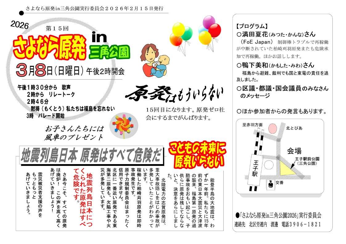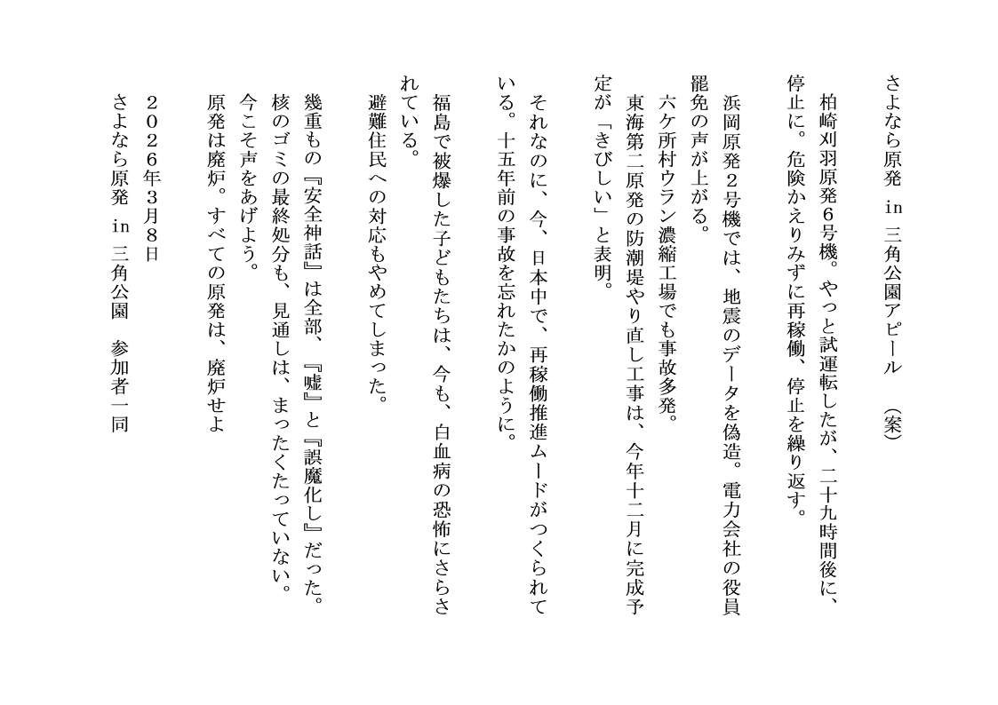 2月10日情報 ![]() 賛同者の皆様へ ★①本日18:30~『高市政権の改憲と戦争の道に反対する2・10官邸前緊急行動』 ★②民医連X 高市「憲法改正をやらせてほしい」発言をうけて ★③2/12~ 連続ウェビナー「東京電力福島第一原発事故から15年 私たちの課題は何か」 ★④脱原発世界ニュース2026 vol.2 ★⑤jpメールマガジン026-008 ★⑥3/8 北区さよなら原発 ㏌三角公園集会とパレード ★⑦新春セミナー第3回 ~~~~~~~~~~~~~~~~ 平和を実現するキリスト者ネット http://cpnet.bona.jp 〒112-0002 文京区小石川2-17-41 富坂キリスト教センター2号館 304号室 e-mail:cpnet@mica.dti.ne.jp> ![]() ℡&Fax:03-3813-2885 ~~~~~~~~~~~~~~~~ 添付資料 2.10官邸前行動 柏崎刈羽原発再稼働抗議声明 ★①本日18:30~『高市政権の改憲と戦争の道に反対する2・10官邸前緊急行動』 高田健です。 【拡散希望】 『高市政権の改憲と戦争の道に反対する2・10官邸前緊急行動』( #0210官邸前緊急行動 ) 2/10(火)18:30~ 首相官邸前 -- 高田健 <kenpo@galaxy.ocn.ne.jp> 東京都千代田区神田三崎町3-3-3 太陽ビル402市民ネット内 許すな!憲法改悪・市民連絡会 03-3221-4668 Fax03-3221-2558 http://web-saiyuki.net/kenpoh/ 戦争させない・9条壊すな!総がかり行動実行委員会 http://sogakari.com/ ![]() 憲法9条を壊すな!実行委員会 http://kyujokowasuna.com/ 九条の会事務局 mag@9jounokai.jp ★②民医連X 高市「憲法改正をやらせてほしい」発言をうけて 高市首相の「憲法改正やらせてほしい」発言をうけて、民医連があげたXに大きな反響がありました。 ぜひ拡散にご協力ください。 https://x.com/miniren6/status/2018882215661441188 ![]() ★③2/12~ 連続ウェビナー「東京電力福島第一原発事故から15年 私たちの課題は何か」 福島原発事故から15年に合わせ、当室は2月12日から週に1回、4回シリーズで連続ウェビナーを企画しました。お申し込みの上、ぜひご参加ください!以下、詳細です。 ・第一回 福島第一原発事故原因 わかったこと、わからないこと 福島第一原発事故の原因はいまだにわからないことが多く存在します。あの時、何が起こったのでしょうか。 〇日時:2026年2月12日 14:00-15:30 〇講師:上澤千尋 | 原子力資料情報室 〇登録URL:us02web.zoom.us/webinar/register/WN_XOpeuOgiS-iosL9d_KMmxA ・第二回 福島第一原発の廃炉と放射性物質の拡散 ![]() 福島第一原発は本当に廃炉できるのでしょうか。また廃炉中に放出される放射性物質はどうなっているのでしょうか。 〇日時:2026年2月19日 14:00-15:30 〇講師:松久保肇 | 原子力資料情報室 〇登録URL: us02web.zoom.us/webinar/register/WN_S_Oce2QWTQWG-ytJyFRF-w ・第三回 市民が作る環境放射能データベース 福島第一原発事故後、各地の市民測定所の測定結果をまとめるデータベースが構築されました。生活者の立場から市民は何ができるでしょうか。 〇日時:2026年2月26日 14:00-15:30 〇講師:中村奈保子 | みんなのデータサイト 〇登録URL: us02web.zoom.us/webinar/register/WN_ro6x6SdsQg6WK5PRWIbQKg ・第四回 科学技術とどう向き合うか 福島第一原発事故と復興の中で、活発なリスクコミュニケーションが行われています。市民は科学技術とどう向き合うことができるのか考えます。 〇日時:2026年3月5日 14:00-15:30 〇講師:八巻俊憲 | 武谷三男史料研究会 〇登録URL:us02web.zoom.us/webinar/register/WN_ZORfU-V0QxmK9uQMkePDRg ※ 当日はZOOMで配信を行います。 ※ 各回ごとにQRコードもしくは原子力資料情報室ウェブサイトhttps://cnic.jpよりお申し込みください。 ※ 参加費:無料(ご寄付を歓迎いたします) ■ 主催・お問合せ:原子力資料情報室(CNIC)https://cnic.jp/ ★④脱原発世界ニュース2026 vol.2 ■■■■■■■■■■■■■■■■■■■■■■■■■■■■ Nuclear Free Now 脱原発世界ニュース2026vol.2 http://npfree.jp 2026.2.7 世界の原発の動きはここでチェック! ※次回配信は2026年3月7日です。 ■■■■■■■■■■■■■■■■■■■■■■■■■■■■ ━━━━━━━━━━━━━━━━━━━━━━━━━━━━━━━━━━━━ ◆注目のトピックス 【イベント】2/12-3/5 連続ウェビナー「東京電力福島第一原発事故から15年 私たちの課題は何か」 【イベント】3/1【3.11から15年】福島からつながる声――核なき世界をめざして 【イベント】3/7「フクシマ原発事故から15年 とめよう原発3.7全国集会―持続可能で平和な社会を―」 【世界の脱原発】ケニア 電力供給の4割が地熱発電 ━━━━━━━━━━━━━━━━━━━━━━━━━━━━━━━━━━━━ 来月、東京電力福島第一原発事故から15年目を迎えます。今もその被害が続いているにもかかわらず、政府は原発回帰から、電力会社の度重なる問題などを深く考慮せず、原発の利用を強く推進しています。福島での原発事故により世界各国で脱原発を求める市民が増え、今は再生可能エネルギーの推進に力を尽くしています。日本では国内外の市民、専門家があの原発事故を振り返るとともに、今ある課題について考えるイベントが多く開催されます。オンラインも含め、ぜひご参加ください。 ┏━━━━━━━━━━━━━━━━━━━━━━━━━━━━━━━━━━
