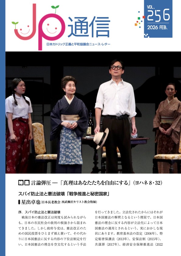 2月14日情報 ![]() 賛同者の皆様へ ★①改憲・戦争反対の大波を! ★②原発事故避難者住まいの権利裁判第17回、18回期日の案内 ★③jpメールマガジン026-009 ~~~~~~~~~~~~~~~~ 平和を実現するキリスト者ネット http://cpnet.bona.jp 〒112-0002 文京区小石川2-17-41 富坂キリスト教センター2号館 304号室 e-mail:cpnet@mica.dti.ne.jp> ℡&Fax:03-3813-2885 ~~~~~~~~~~~~~~~~ 添資料 高田健さん談話 原発避難者住まいと人権裁判 宗教者集会 土曜講座 気がかりな日米関係 ★①改憲・戦争反対の大波を! 高田です。 今回の総選挙を考えるうえで、大変参考になる記事(2/13朝日・オピニオン&フォーラム)です。朝日をとっていない方は販売店に足を運ぶ価値があると思います。 ![]() 高橋純子記者の編集です。 私は2/13の赤旗紙に「改憲・戦争準備反対の大波を」というコメントを書きました。3日前の談話ですから、10日のことはコメントできませんでした。3月号の「月刊社会民主」の巻頭言にも総括関連の文章を書く予定です。2月10日の官邸前の400人強の結集と、その前後のおどろくほど多数のXやFBの反応に注目しましょう。初めての参加者、若い参加者がこれまでになく多かったことに確信をもちましょう。私たちが多数派だと言いたいのではありません。少数派の中から行動する人びとが登場し始めたこと、これは今次総選挙のもたらした結果です。 https://www.asahi.com/articles/DA3S16403326.html (考論 長谷部×杉田+加藤陽子)「歴史的圧勝」の意味 有料記事 2026年2月13日 5時00分 異例ずくめの真冬の総選挙は、大した政策論争も行われぬままいつしか首相の人気投票に変質した感があり、結果、自民党の歴史的圧勝に終わった。してやった/してやられた感がいまだに抜けない。とはいえ高市政権の前途には、内政、外政とも課題が山積する。この国の議会制民主主義はどこへ向かうのか。憲法、政治、歴史を… この記事は有料記事です。残り6281文字 On Thu, 12 Feb 2026 16:08:08 +0900 <hico@jcom.zaq.ne.jp> wrote: 高田健 <kenpo@galaxy.ocn.ne.jp> 東京都千代田区神田三崎町3-3-3 太陽ビル402市民ネット内 許すな!憲法改悪・市民連絡会 03-3221-4668 Fax03-3221-2558 http://web-saiyuki.net/kenpoh/ 戦争させない・9条壊すな!総がかり行動実行委員会 http://sogakari.com/ 憲法9条を壊すな!実行委員会 http://kyujokowasuna.com/ 九条の会事務局 mag@9jounokai.jp ★②原発事故避難者住まいの権利裁判第17回、18回期日の案内 第17回期日 2月16日(月)13時集合 ◆東京地裁前集会 13:00~13:30 ◆第17回期日 103法廷 14:00~ 次回期日は本人尋問が16:30まで予定されているので報告集会は中止とします。 東電原発事故によって避難区域外から国家公務員住宅に避難した世帯に対し、福島県は、家賃2倍相当の損害金を請求し、親族宅に訪問してまで退去を迫っています。避難の権利のみならず、生存権・居住権の侵害に相当します。11名の避難者が、精神的賠償と居住権を求めて裁判に訴えました。原告は以下を訴えています。 〇福島県の行為は国際人権法で定められた「避難民の居住権」を侵害する 〇福島県が住民票を勝手に閲覧し親族を訪問してまで恫喝をかけたことは違法である 〇福島県が結ばせた契約を福島県は勝手に書き換えており、無効である 裁判は佳境に入り、次回、2月16日の第17回期日と次々回、2月25日の第18回期日において、原告11人に対する本人尋問が開かれます。ぜひご参加ください。 ◆原発事故避難者・住まいの権利裁判へ! 第17回期日(原告本人尋問) 2月16日(月)13:00東京地裁前集合 13:00~13:30 東京地裁前集会 14:00~ 第17回期日(103法廷) 第18回期日 (原告本人尋問) 2月25日(水)13:00東京地裁前集合 13:00~13:30 東京地裁前集会 14:00~ 第18回期日(103法廷) ★カンパのお願い★ 資金が底を尽きてきました。以下にカンパをお寄せください! ゆうちょ銀行 〇一八店 普通 9498194 住まいと人権裁判を支援する会 原発事故避難者住まいの権利裁判を支援する会 代表世話人 熊本美彌子/村田弘/武藤類子/福島敦子/渡辺一枝 事務局 瀬戸大作 setodaisaku7@gmail.com ★③jpメールマガジン026-009 2026.2.13 jp026-009 正義と平和協議会メール情報 ***jp***jp***jp***jp***jp***jp***jp*** 日本カトリック正義と平和協議会からお知らせです 1.宗教者・市民集会「私たちは『力こそ正義』にどう立ち向かうか」(2026.2.19 東京) 2.えん罪・再審(やり直し裁判)の法改正を!大署名運動キックオフ市民集会(2026.2.20 東京) 3.真生会館土曜講座 「ヌチドゥ宝(命は宝)」 (2026.2.21 東京 オンライン)添付3 4.聖イグナチオ教会メルキセデクの会講演会「気がかりな日米関係」(2026.2.21 東京) 5.平和アピール1981「バック・トゥ・ザ・フューチャー」(2026.2.22 広島 オンライン配信) 6.イエズス会社会司牧センター 2026新春セミナー(2026.3.4 東京) ***jp***jp***jp***jp***jp***jp***jp*** 1.宗教者・市民集会「私たちは『力こそ正義』にどう立ち向かうか」(2026.2.19 東京)添付1 2026年1月23日の高市首相による私利私欲の解散が行われ、2月8日に投開票がおこなわれました。私たちは高市首相の暴挙を許しません。 ジャーナリストの布施祐仁さんから、お話をいただ