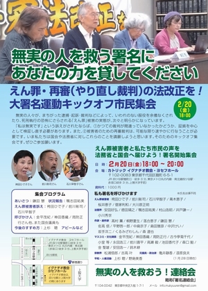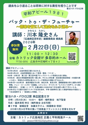 2月20日情報 賛同者の皆様へ ★①2/19 院内集会の新聞記事 ★②2/22 信じられる未来へ ★③2/24 ウクライナ侵攻4年 ★④jpメールマガジン ★⑤新春セミナー ~~~~~~~~~~~~~~~~ 平和を実現するキリスト者ネット http://cpnet.bona.jp 〒112-0002 文京区小石川2-17-41 富坂キリスト教センター2号館 e-mail:cpnet@mica.dti.ne.jp ℡&Fax:03-3813-2885 ~~~~~~~~~~~~~~ 添付資料 新聞赤旗2.20 0224集会案内ちらし 死刑廃止セミナー福岡 鶴岡講演会 第42回ウクライナ祈祷会ちらし ★①2/19 院内集会の新聞記事 皆様 昨日はお疲れ様でした。 しんぶん赤旗に掲載していただきました。お送りいたします。合掌 武田隆雄 拝 「平和をつくり出す宗教者ネット」事務局 〒150-0045 渋谷区神泉町8-7 日本山妙法寺内 TEL 03-3461-9363 FAX 03-3461-9367 nqh10948@nifty.com https://twitter.com/syukyosyanet https://www.facebook.com/syukyosyanet/ ★②2/22 市民連合アクション: 信じられる未来へ 信じられる未来へ 希望の新しい選択肢 市民と野党の共同アクション 先の選挙でションボリしているみなさん、本当の闘いはこれからです。 真に「信じられる未来」のために、市民連合はまた街頭から始めます。 立憲民主党、日本共産党、社会民主党、新社会党、沖縄の風等々の代表や国会議員も結集します。 新しい立憲政治を街頭からいっしょにつくりませんか? どなたでも、志ひとつでご参集ください。 2/22(日)14:00~ 場所:有楽町イトシア前 主催 市民連合 高田健 <kenpo@galaxy.ocn.ne.jp> 東京都千代田区神田三崎町3-3-3 太陽ビル402市民ネット内 許すな!憲法改悪・市民連絡会 03-3221-4668 Fax03-3221-2558 http://web-saiyuki.net/kenpoh/ 戦争させない・9条壊すな!総がかり行動実行委員会 http://sogakari.com/ 憲法9条を壊すな!実行委員会 http://kyujokowasuna.com/ 九条の会事務局 mag@9jounokai.jp ★③2/24 ウクライナ侵攻4年 原水禁が事務局を務めます「さようなら原発1000万人アクション」から、集会「ロシアのウクライナ侵攻4年 戦争になったら原発は標的になる」開催のご案内です。 集会「ロシアのウクライナ侵攻4年 戦争になったら原発は標的になる」 日 時:2026年2月24日(火)18時半~(18時開場) 場 所:連合会館204会議室(千代田区神田駿河台3-2-11) 資 料 代:1000円 講 演:鈴木達治郎さん(NPO法人ピースデポ代表/長崎大学客員教授) タイトル:「核施設への攻撃リスク -対応は本当にできるのか」 ※事前のお申込みは不要です。当日会場にお越しください。 http://sayonara-nukes.org/2026/01/20260224meeting%E2%80%97notice/ もし原発や核施設が攻撃によって壊滅的な被害を受ければ、放射性物質が国境を越えて拡散し、周辺住民だけでなく、人類全体に計り知れない惨禍をもたらします。 原発は「安全保障」に資する存在ではなく、ひとたび戦争が起きれば、極めて危険な標的となります。 この集会では、「戦争×原発」という視点で、脱原発がなぜ必要なのかを考えます。 チラシを添付いたしますので、ご確認いただければと思います。あわせて、転送等、情報拡散していただけますと幸いです。 ☆☆☆☆☆☆★★★☆☆☆☆☆ フォーラム平和・人権・環境(平和フォーラム) 橋本 麻由 〒101-0062 東京都千代田区神田駿河台3-2-11 連合会館内 TEL 03-5289-8222 FAX 03-5289 ★④jpメールマガジン 2026.2.20 jp026-010 正義と平和協議会メール情報 ***jp***jp***jp***jp***jp***jp***jp*** 日本カトリック正義と平和協議会からお知らせです 1.第42 回 ウクライナを覚えて平和を祈るキリスト者祈祷会 (2026.2.24 オンライン) 2.福岡司教区社会福音化委員会セミナー 「カトリック教会はなぜ死刑廃止を目指すのか 」(2026.2.28 福岡)添付1 3.ピース9の会呼びかけ人松浦悟郎さんのお話し「争い続ける世界の中で子供たちに残す平和」(2026.3.7 山形・鶴岡)添付2 4.キリスト者死刑廃止ネットから 動画の紹介など ***jp***jp***jp***jp***jp***jp***jp*** 1.第42 回 ウクライナを覚えて平和を祈るキリスト者祈祷会 (2026.2.24 オンライン) 今月24日は、ロシアによるウクライナ侵攻が始まった2022年2月24日から3年目となります。 私たちは、何度、来月は祈祷会を行う必要がなくなっていますようにと祈ったことでしょう。 今回は、この3年間、継続的にウクライナから避難した方々を支援してきた日本YMCAから、支援活動の現状を報告していただく予定です。 日時 2026年2月24日(火) 20:00 ~ 20:45 https://us06web.zoom.us/j/83526748764?pwd=M3NBTTR0L1J1bU1ISzdhUXRLQWlWdz09#success ID:835 2674 8764 パスコード ****** 共催:日本キリスト教協議会 平和を実現するキリスト者ネット 日本カトリック正義と平和協議会 2.福岡司教区社会福音化委員会セミナー 「カトリック教会はなぜ死刑廃止を目指すのか 」(2026.2.28 福岡) 添付1 前教皇フランシスコは「教会は福音の光のもとに死刑は許容できません。人格の不可侵性と尊厳への攻撃だからです」と教え「全世界で死刑が廃止されるために努力します」と表明しました。世界で死刑廃止国は100カ国を超え、2024年にはカトリック信徒で冤罪死刑囚だつた袴田巖さんに無罪判決が出ました。神が授けた生命を奪う「死刑」の問題について専門家をお招きして学びます。 講 師